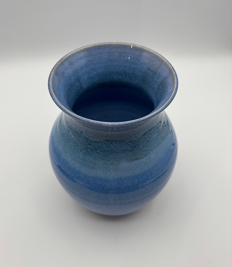 Beautiful handmade blue vase. The vase is 8 inches tall, 6 inches wide in the middle and a little inches 5 inches wide at the rim.