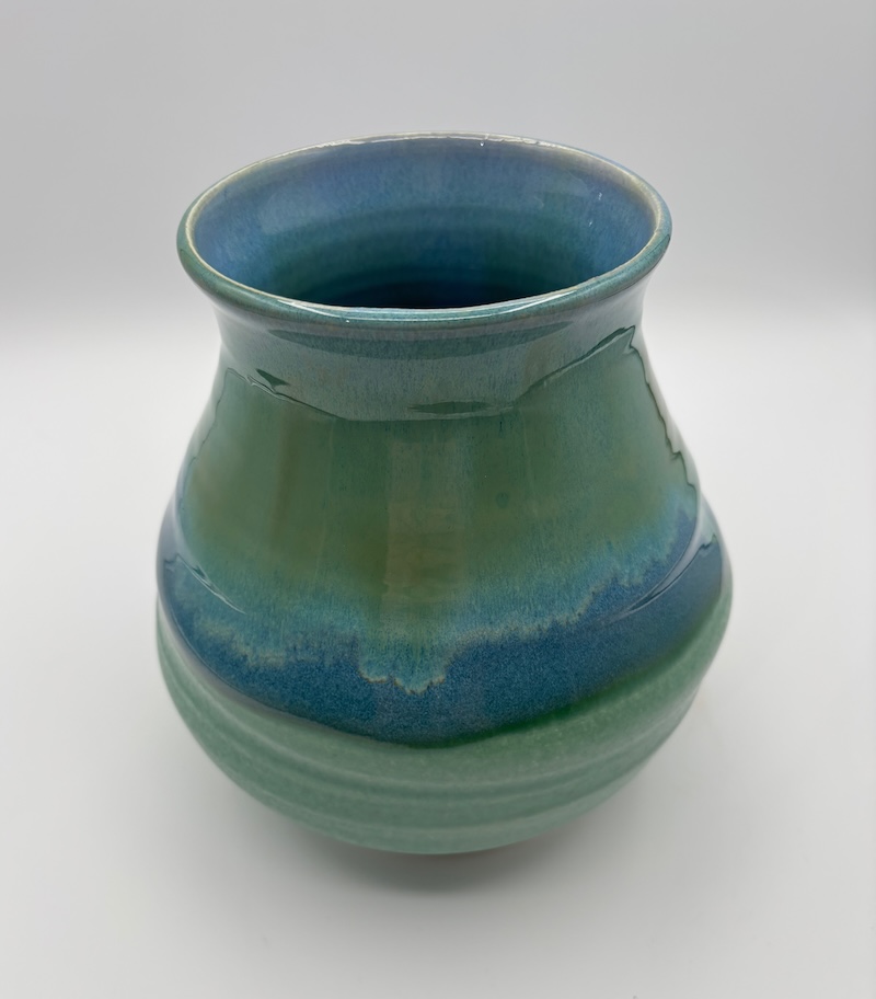 Wonky off-center vase glazed green and blue. 7.25 inches wide and 6.5 inches near the base. The rim is width is 4.25.