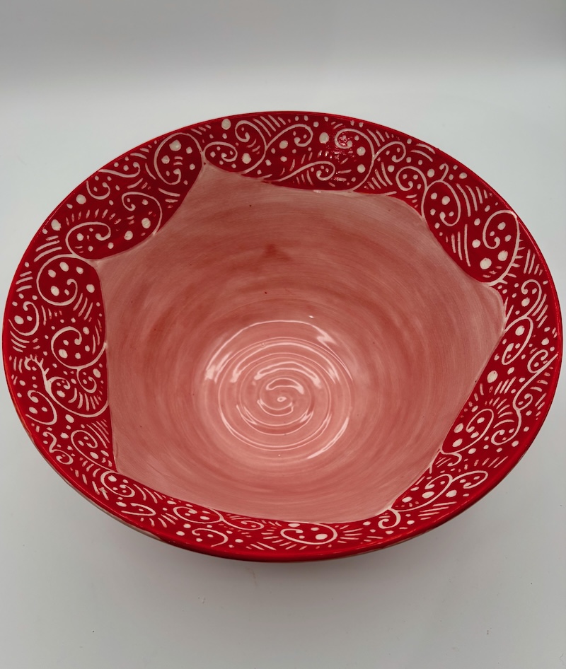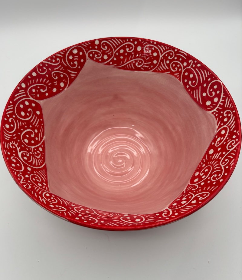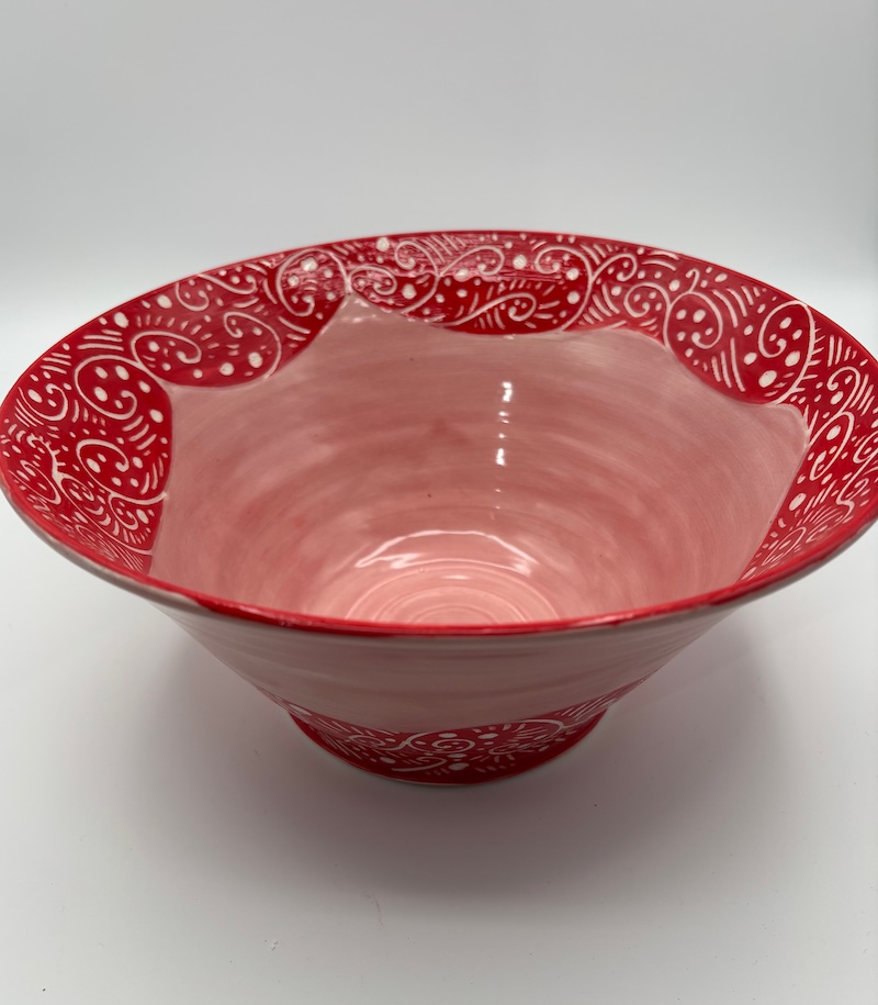 Medium size hand thrown bowl with a porcelain clay body. Red sgraffito day dream design with a pink celadon glaze.