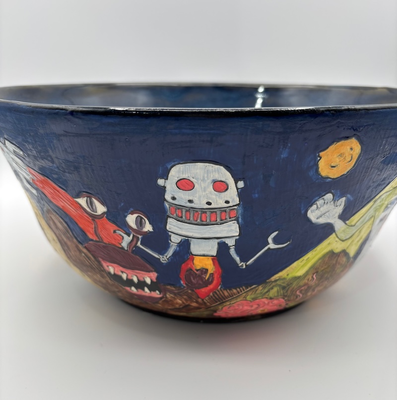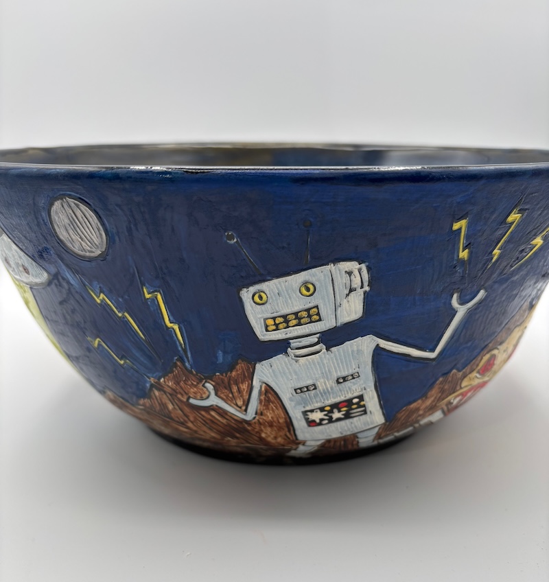 This bowl was thrown on the wheel. When it dried, Milly applied a black underglaze and carved the aliens vs robots illustration into the bowl. Then she went back over with underglazes to color them in.