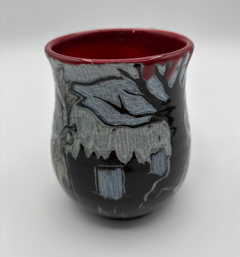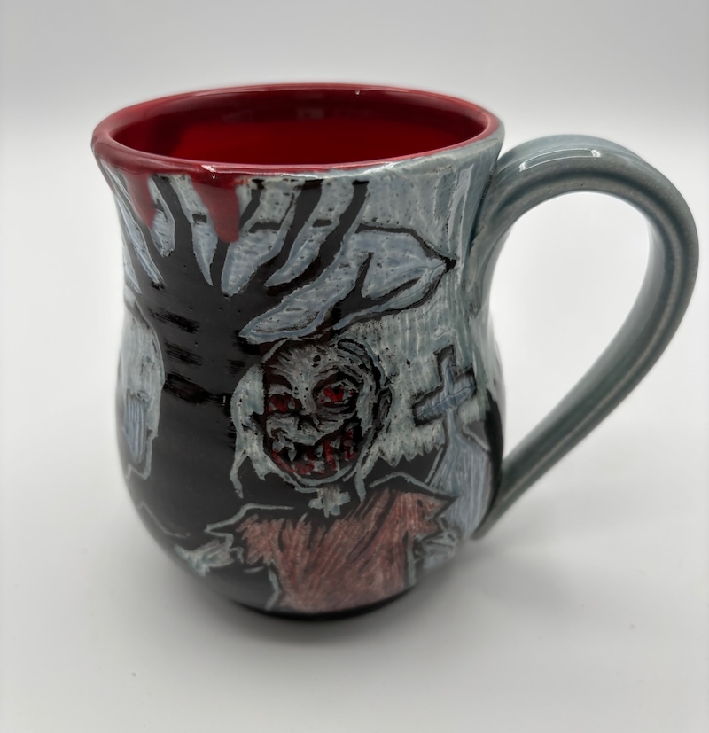 Handmade mug thrown on the wheel with a hand carved zombie apocalypse design. Then the details were hand painted.