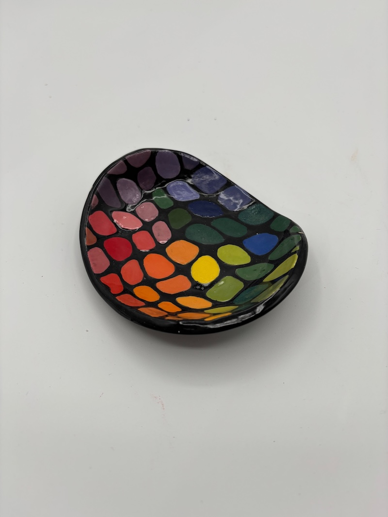 Small dish painted with Mary’s Rainbow Prismatic collection.