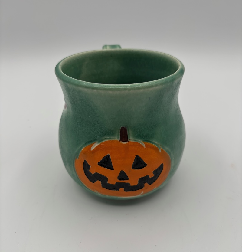 Cute witchy cats with a Jack-O-Lantern in the center. This handmade mug will help you get into the Halloween and spooky season.  4.5 inches wide with the handle and 3.5 inches tall.